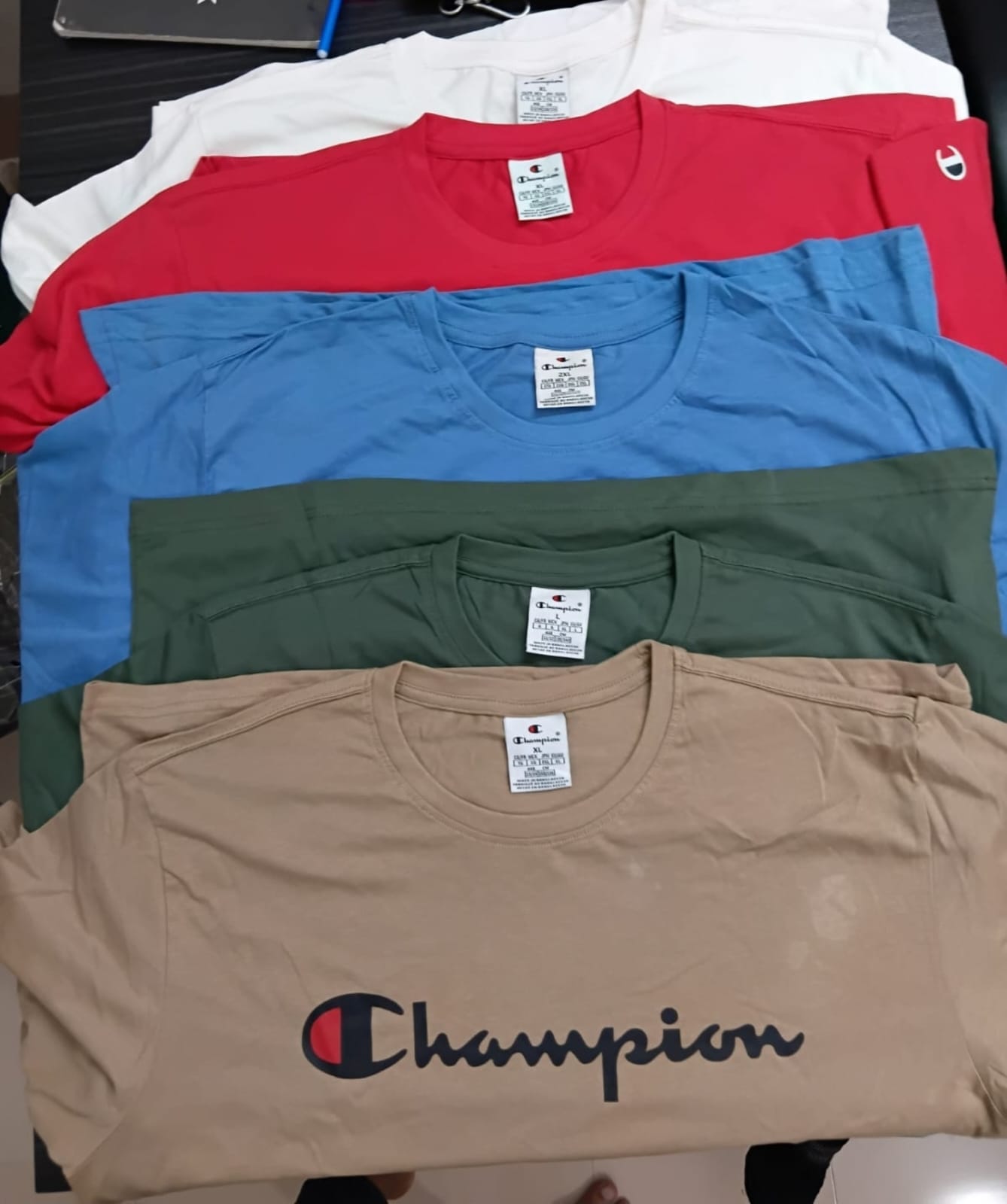 Men Champion t shirts Quantity : 5000 pcs ( partial quantity 300 pcs possible) Color &style : 5+ Size : s to xxl Garments door to door delivery possible