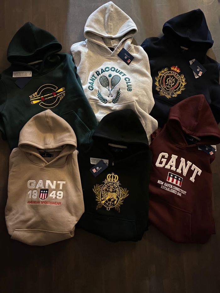 Gant Hoodies Colors - 6 Sizes - M,L,XL,XXL Ratio - 1:1:1:1 Quantity - 3000 Pieces Please Contact us for further details and more varieties. Whatsapp - +918097145413