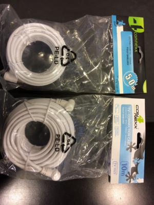 Coax Cables 5 meter & 10 meter. Packaging with EAN code. At least you have to purchase 100 pieces a time. The price will be: 5 meter € 1,50 per cable 10 meter € 2,50 per cable With sending exclusive sending costs