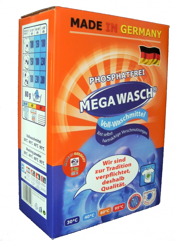 Unser neu entwickeltes Produkt – MEGA WASCH- geeignet für Weiß und Buntwäsche, ist ein beliebter Klassiker im Bereich von Vollwaschmittel und ermöglicht die Reduzierung der Waschpulvermenge, bedingt durch neue Zusätze wie Fleckenentferner. Das phosphatfreie Produkt entwickelt bereits ab 30 °C seine hervorragende Waschleistung und ist einsetzbar bis 95°C, geeignet für Handwäsche sowie alle elektrischen und handbetriebenen Waschmaschinen.